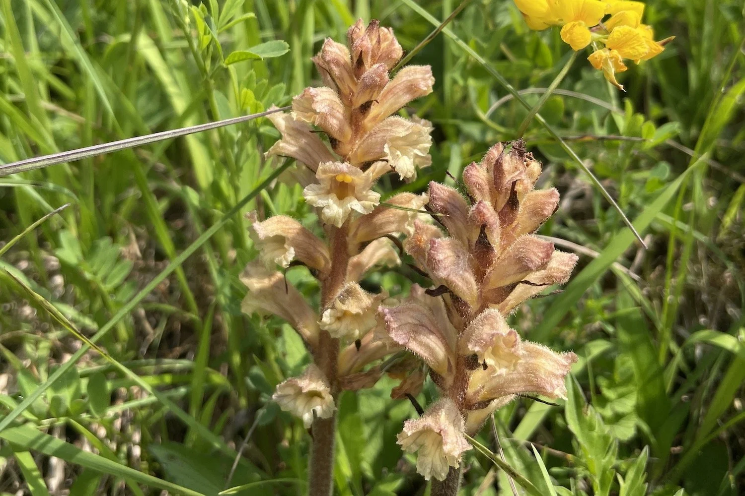 unten. Gelber Würger (Orobanche lutea) auf der Gelben Luzerne - oben: Essig-Rose (Rosa gallica)